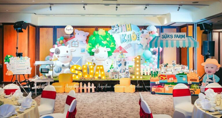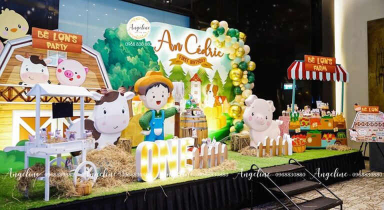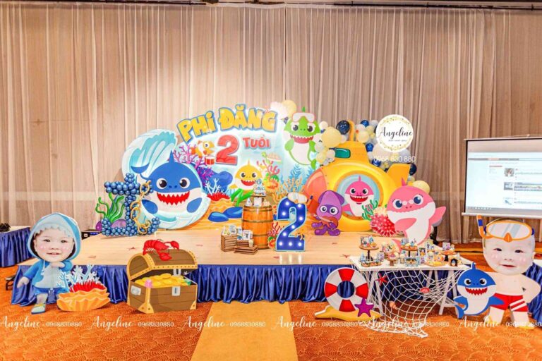 1. Backdrop fomex (Vách tròn/chữ nhật): – Vách tròn: kích thước 1,8 – 2m – Chữ nhật: kích thước 1,2m x 2,2m – 02 mô hình dựng sàn theo chủ đề 2. Bàn tiệc decor: – Bánh gato kem tươi (bánh gato tròn size 20cm, cao 12,5cm) – 10 bánh cupcake kem – 06 mũ